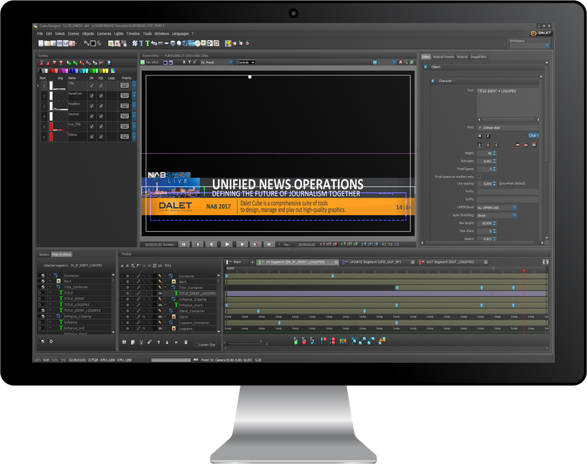 - Designed for Story Development – Dalet OneCut editors can position Dalet Cube graphics in the timeline/over video, preview the graphics overlay (including animations) and define behaviors. And because Dalet Cube graphics rendering is managed by a server, the local station performance is never affected.