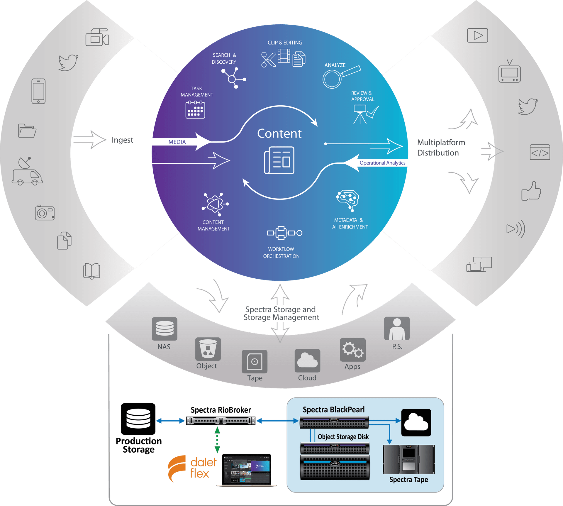 Dalet Flex and Spectra BlackPearl work together to bring a fully integrated solution tested and certified to meet a media-rich organization’s remote production needs. With the capabilities of both platforms across production and asset management, Dalet Flex and Spectra BlackPearl support integrated workflows, promoting greater efficiencies, where each platform’s benefits are passed on to end users. Both companies aim to better connect users to content no matter where they are located.