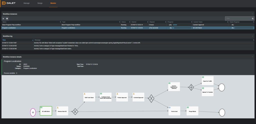 For program and archive workflows, with the easy-to-use workflow designer, administrators can setup complex orchestrated workflows with both automated and manual tasks. When the asset appears in Dalet it becomes a task of the Dalet Workflow Engine, which triggers different automated tasks and assigns jobs to users. As users claim different tasks, Dalet Galaxy automatically opens up the correct program for that task, such as the QC Playout module, or an Asset Management form to enter metadata for search.