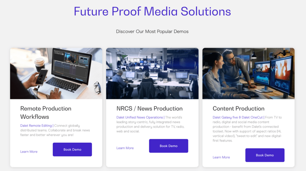 Our demo artists are available worldwide in your specific time zones to present Dalet cutting-edge products and solutions designed to empower your teams, safeguard your operations, and streamline your workflows through the current crisis and for years to come!
