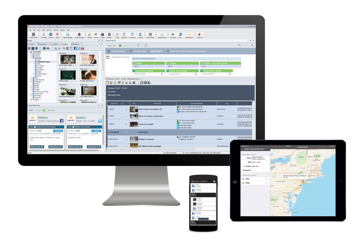 The foundation for Dalet productivity-enhancing workflow solutions, Dalet Galaxy is the enterprise NRCS and MAM that unifies the content chain by managing assets, metadata, workflows and processes across multiple and diverse production and distribution systems. Specially tailored for news and media workflows, this unique technology platform helps broadcasters and media professionals increase productivity while providing operational and business visibility.