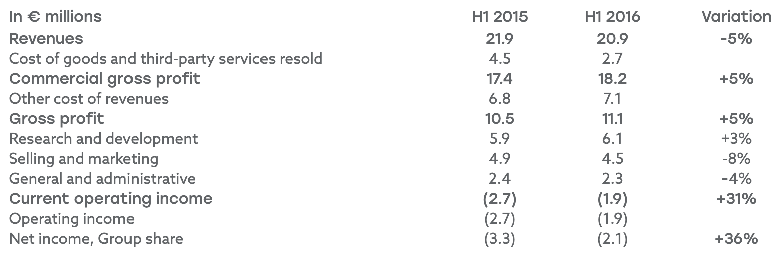 After €0.1 million in financial expenses and €0.1 million in tax, net income for the semester amounted to a loss of €2.1 million as compared to a loss of €3.3 million for the first semester of 2015.