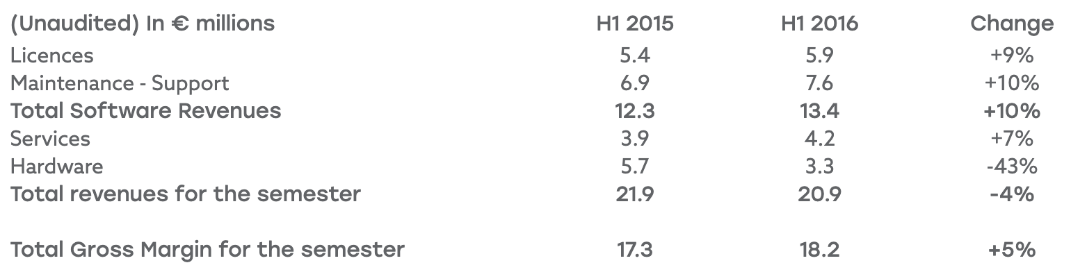 As a direct consequence of the decrease in hardware resale, total consolidated revenues for the semester were down by 4% at €20.9 million. However gross margin (defined as sales minus cost of goods and third-party services resold) increased by 5% at €18.2 million, reflecting the more favorable sales mix. Gross margin rate increased to 87% of revenues over the first semester of 2016 up from 79% for the same period in 2015.