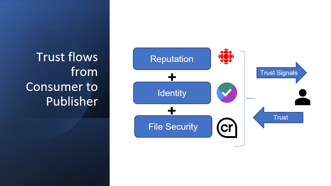 Well-established brand identities are hard earned and can be hijacked to provide false confidence or amplify malicious sources of misinformation. Providing cryptographic protection to the provenance is a defense against this form of attack. Brand values technology must support, and not supplant the long-established trust relationships between media brands and their audiences. The responsibility for the veracity of content as a basis for continued trust in the brand is a journalistic and marketing responsibility. This is unchanged. However, the emergence of AI-generated media requires two additional technical foundation layers – Validated Identity and Tamper-Evident File Integrity.