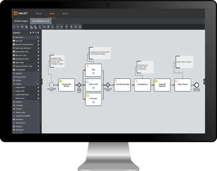 The engine orchestrates and automates a combination of user tasks and media services such as ingest, logging, editing, transcoding, QC, media packaging and distribution. The user-friendly Workflow Designer interface lets administrators intuitively model business processes by simply drag-and-dropping from a palette of stencils that span user tasks & notifications, media and metadata services, gateways, timeout and error management, and much more. This greatly simplifies preparing and delivering packages that require multiple languages, multiple graphic assets, multiple audio tracks, multiple subtitle tracks, and different delivery formats. Combined with Dalet Galaxy API, this provides an open framework that connects over 90 industry-leading vendors from storage & infrastructure technologies, to media services and post-production applications, to traffic and business platforms.