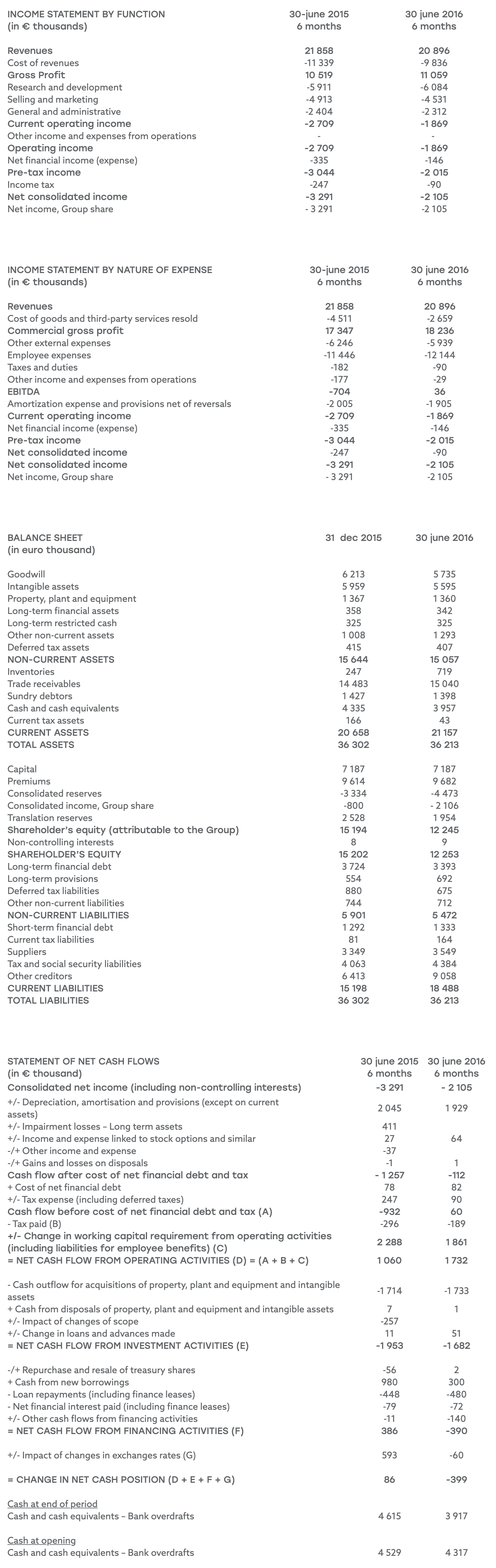 After €0.1 million in financial expenses and €0.1 million in tax, net income for the semester amounted to a loss of €2.1 million as compared to a loss of €3.3 million for the first semester of 2015.