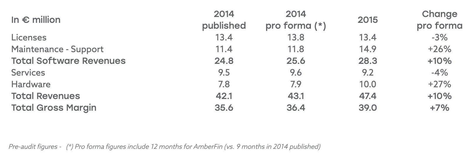 Pro forma, Dalet’s Software revenues for 2015 grew 10% driven by the increase in maintenance-support contracts linked directly to the number of licenses sold in 2014. License revenues were both strong and stable in 2015, with Brio solution sales accelerating over the period.